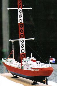 MIKE SAYS: I was interested to see the model of the Ross Revenge on your great web-site and thought you might like to see the one that I have constructed using the very same model. I hope that you like it, as you can see a lot of work has gone into getting it as near accurate as possible. The main pictures, as you can see, are of one ship in almost finished condition. I have, in fact, made two and they are both now finished and look great if I do say so myself. (See photo below) The first one I am going to keep, the second I intend to put on e-bay. I spent a lot of time on the Ross and did quite a few broadcasts from the ship i.e., several RSLs and also probably the last time she broadcast illegally from inside British waters. They were great days and I miss the ship and all those involved at the time greatly. My health stops me going to stay on the ship now but making the models has brought back a lot of great memories, looking at photos of the Ross, etc, to help in making the models. Keep up the good work with your site it's well worth it LA and kindest regards,Mike Stewart |