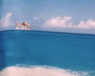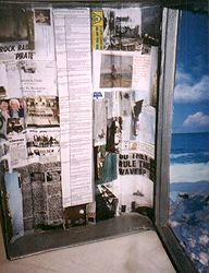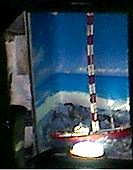 The guy I made the model for had a problem with where to store it and how to illuminate it. Being only a 1/47 scale model and in plastic, the model was too small for Fredericia-type wheat bulbs, with a threat of possible fire/melt danger. "San Tan Greenore", here in the Welsh Republic has many ships' chandlers. At one, I found a genuine sailor's metal kit trunk, in a bad state. (above, right). This was purchased, sanded and coated with anti-rust engine block paint as used on Morris Minors. On it, I put a backdrop, (below, left) with Shivering Sands forts and the DTI vessel Dioptric Surveyor on the horizon. Cotton wool clouds followed by cotton wool sea were then installed and painted to suit. |