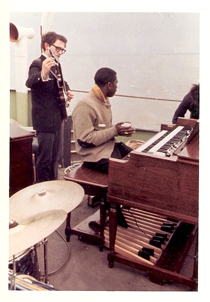 came about mainly because Ronan was a huge jazz fan and thought it was a wonderful idea, but the feasibility of getting the Hammond aboard had not exactly been carefully planned and the practicalities had barely been considered. Low-sided vessel or not, a crane would in fact have been very useful. Tony Thorpe recalls,"Two blokes holding one end of a brand new Hammond C3 on the tender, two blokes holding the other end on the deck of the boat and 15 fathoms of North Sea underneath." The C3 had been supplied by Boosey & Hawkes and what became of it after its adventure on the North Sea is unknown.