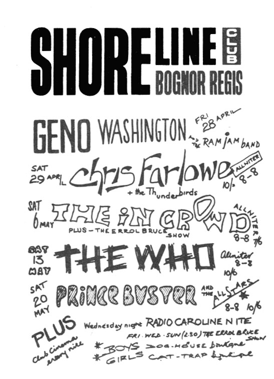 I came across this photo of me, sandwiched between Peter and Gordon and hanging on to 'Lady Godiva'! It was taken at Wimbledon Palais circa Sept/Oct 1966, when the song was moving up the Caroline Countdown of Sound. 'Lady Godiva' rode around the Wimbledon Palais dance floor on a white horse... Now that was a sight to behold! I thought the photo might add an "interesting dimension" to the Big L website. I also read your review of the book by Mike Read regarding the south coast music scene in the Sixties. There was a reference to the Wednesday night 'Caroline Nite' at the Shoreline Club in Bognor Regis. Here's a photo of a handbill that I saved from a visit there some time in '67 when I emceed an appearance by The Turtles. I don't remember an awful lot about the club although it was packed to the rafters so it must have been a popular venue. Many thanks to Steve for rescanning the Shoreline poster in 2012 to reproduce the nice, clear copy on the right. Note that the 1967 poster promotes a regular 'Errol Bruce Show'. Errol, of course, broadcast from both the North and South ships, and Swinging Radio England. (Click on the poster to enlarge.) The question is, does anyone own up to having been the lady who took the role of Lady Godiva? We reckon if that Peter and Gordon promo happened now, 'Lady Godiva' would probably be completely naked - and so would the horse! – Mary |