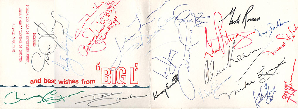 | An autographed Radio London Christmas card from 1966, when Chuck joined the station. It was a gesture to welcome Chuck's wife 'Mrs Blair' (whose name, of course, was not 'Blair') to the UK. Norm thinks the signatures are genuine. He says, "The Folks in Curzon Street would often have 'Names' sign a lot of cards and these would be used later as they saw fit for all special occasions. Others, however, have their doubts. Mark Roman says his name has been forged and some of the celebrity autographs do not match up to examples found elsewhere on the net. If they are real, this is an extremely valuable Christmas card (we believe 'Bingo Stain' was a member of a rather well-known band) but the signatures would need expert evaluation. (Click on photo to see large version.) |