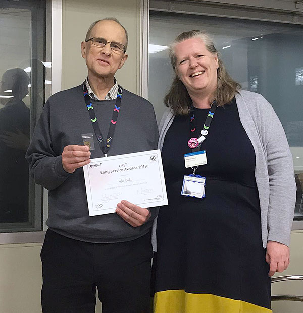 I totally understand how devastated you feel. Alan had played a big part in my life over the last 40 years, since I started at RWM at 17. Another RWM member described him as your “favourite uncle”. Someone to go to for advice, help, chat and laughter then pop down the pub together for his favourite pint of bitter. Alan gave his time to RWM and the Church unselfishly and asked for nothing in return. I have attached a photo of Alan and the DoN at West Mid, which was taken at the beginning of Feb 2020, when he was presented with his 50 year voluntary service award. They had to get a special badge made as no one had achieved 50 years before.
