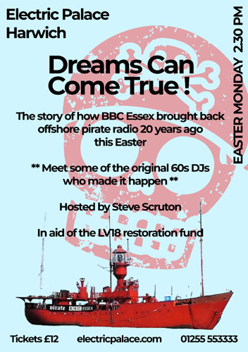 Noon to 1400 BBC Radio 2, Clash of the Pirates – Johnnie Walker and Tony Blackburn compete to be Caroline's Top Renegade Easter Saturday March 30 0500 BBC Radio 2, a repeat from 2017 of Johnnie Walker Meets the Pirates 1400 - 1800 BBC Essex – Steve Scruton and Ian Wyatt present a 4-hour Pirate BBC Essex Anniversary Special Easter Sunday March 31 Two Sixties films show at the Electric Palace Theatre, Harwich, Easter Sunday March 31st 0300 - 0500 BBC Radio 2, Johnnie Walker presents a special in his 'Sounds of the 70s' series. Titled 'Walker on Walker', JW, who launched his career on Radio England alongside Roger Day, recalls his colourful life. Also available on BBC Sounds. 1930 Dateline Diamonds showing at the Electric Palace Theatre, Harwich Easter Monday, April 1st 1430 Electric Palace Theatre, Harwich, 'Dreams Can Come True'. Steve Scruton, Keith Skues and Roger Day and their audience remember Pirate BBC Essex, 2004 |