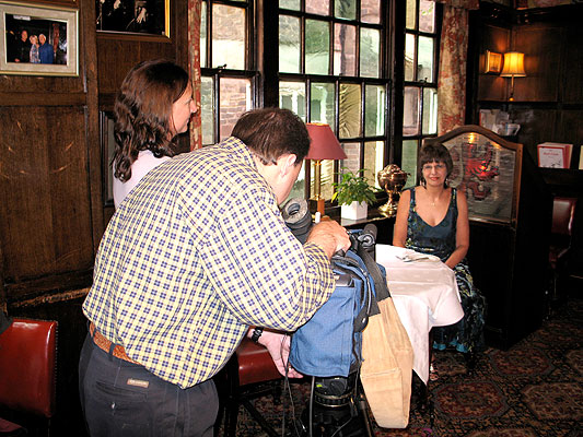 Filming Mary in the restaurant for Grey's SRE documentary. (Note the red lion on the glass panel behind her.) |