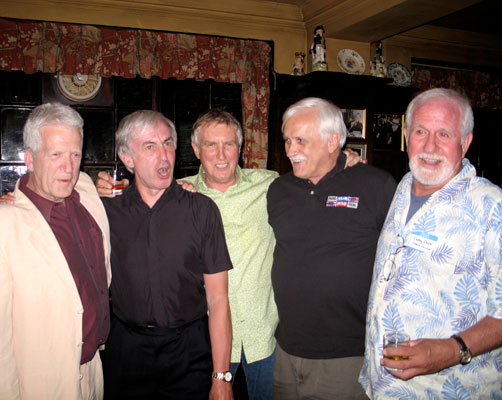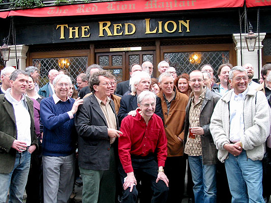 | In 2002, John Aston, Mick Luvzit, Gord Cruse, Kenny Tosh, Graham Webb and Bud Ballou paid a visit to the pub on a Sunday and disappointingly, found it closed | A much bigger group poses outside in 2004, during Roger 'Twiggy' Day's Caroline reunion |