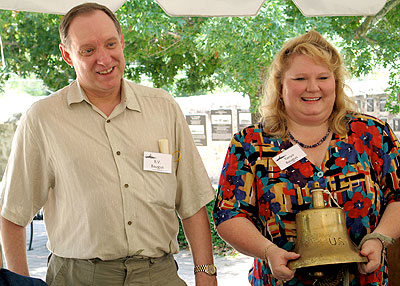 Tribute by Mary Payne We first met in 2001 in her home state of Texas. The internet was in its infancy and we had recently discovered (via John Platt) that the WWII shipmates of the USS Density had been holding reunions since 1964. Tanya's father Laverne (known as Verne) was one of those shipmates and his family was organising the 2001 event in Dallas. Tanya was so happy that we, and original Radio London founders Ben Toney and Tom Danaher, could attend and would be giving a presentation about the later life of the USS Density as the mv Galaxy. The USS Density family is a very special one and the bond between everyone attending was the beloved ship known as 'The Mighty Little D'. Chris and I arrived at the Dallas hotel on September 10th to allow us to recover from jet-lag before the reunion. On the next day, the tragedy of the terrorist attack on the World Trade Centre unfolded. Aware that we knew nobody in Texas and faced uncertainty about being able to return home, Tanya and her parents made us so welcome. Her mother, Marie, adopted us into their family. They always told us that they loved us and we called Tanya 'Little Sis', while she called us 'Big Sis' and Bro-in-Law'. We also enjoyed meeting our new bro-in-law, Tanya's husband R.V., a man with a great sense of humour. Afterwards, Tanya emailed to say: We saw Tanya in 2002 when she made a flying visit to London en route to a Scandinavian business trip. She and I had a great day out in the city that she had always wanted to see, visiting the Tower of London and other landmarks. Tanya was so overwhelmed that when she saw the River Thames, she cried. We enjoyed afternoon tea at Harrod's where, being a huge fan of Star Trek, Tanya followed the example of Captain Jean-Luc Picard and ordered "Tea, Earl Grey, hot"! The next day, Chris and I took Tanya on a tour of our local countryside, where she was particularly taken by Hughenden Church. We also visited West Wycombe Hill and the church at the top. We so wished that Tanya could have stayed for longer. Our next two meetings were not until we attended subsequent USS Density reunions in Branson, Missouri in 2003 and San Antonio, Texas, in 2007. I last saw Tanya in May 2008, when I visited Fort Worth on my own to attend the premiere of Grey Pierson's film, "Swinging Radio England - a Tale of Pirates Texans and Teenagers'. Tanya came as my guest and we enjoyed the film and Grey's hospitality and saw each other on nearly every day of a wonderful week. Ron Buninga, the son of the mv Galaxy's captain Bill, who had been instrumental in returning the ship's bell to the WWII shipmates, emailed us to break the terrible news of Tanya's passing. The photo on the left is Tanya and her husband R.V. at the presentation ceremony of the USS Density bell to the Museum of the Pacific War in Fredericksburg, Texas, in 2007. Chris and I are deeply saddened to have lost a dear and loving friend at such a young age. We have so many happy memories of Tanya and the enjoyable times we shared, even though they were all too few. We shall treasure the gifts she gave us, one of which is the Christmas wreath that always adorns our front door during the festive season. Will always miss our unforgettable 'Little Sis'.