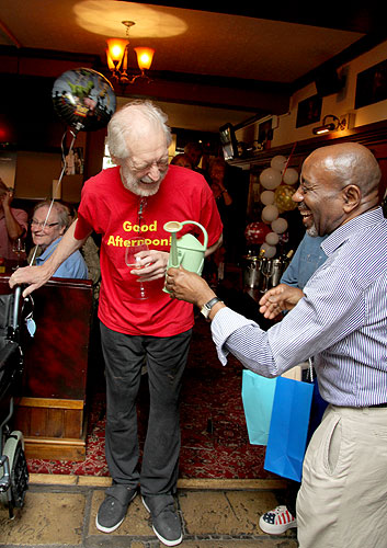 | Big L's Duncan Johnson celebrated his 75th birthday with a party organised by Liza Donoghue and his many friends, who clubbed together to buy him a raised flowerbed (i.e. a windowbox on legs). (Left) Michel Philistin presents the essential gardening gift. (Photos: Mary Payne) | |