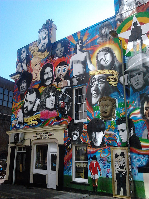 Peel's Wall of Fame – Brighton's Full of Fab Forty Artists! Left, detail of the mural: John Peel is flanked by Jimi Hendrix and Marc Bolan, two of his favourite Fab Forty artists. |