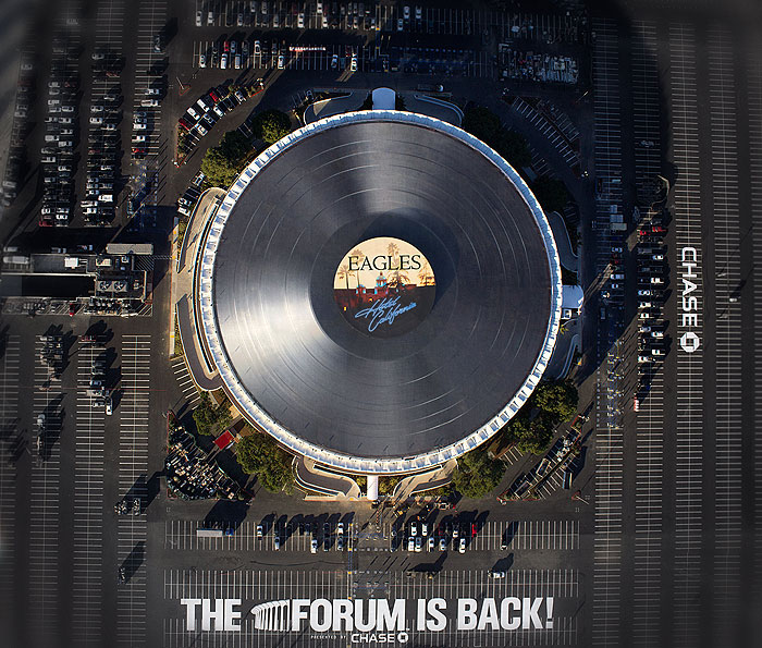 The Forum in Los Angeles, an iconic California venue since the Sixties, revamped its roof into a giant spinning vinyl album to promote its reopening after major refurbishment. As the Eagles are the first band to give concerts there, the roof-topper is a giant replica of their multi-platinum bestseller, 'Hotel California'.