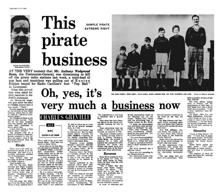 On December 12th 1965, when Postmaster-General Tony Wedgwood Benn was threatening to kill off the pirates, the Daily Mail published a feature about the business of offshore radio, with a photo of Brian Cullingford the 'gentleman pirate' of Radio 390 and a family portrait of Philip Birch and his family. (Thanks to Hans Knot)
