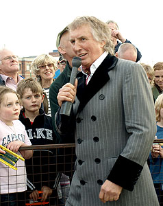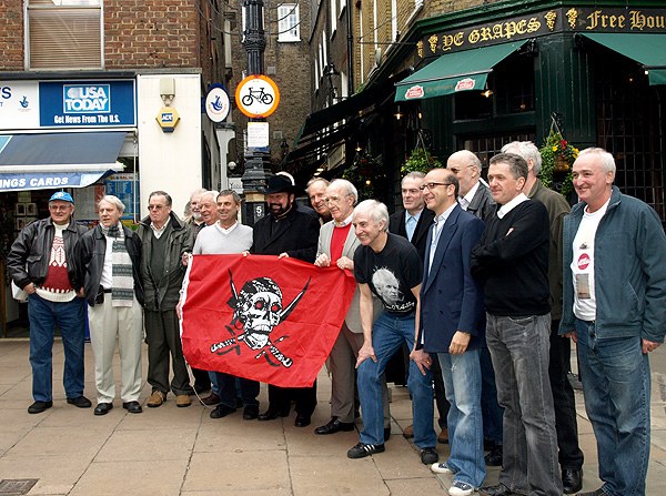 This time, instead of being anchored in the harbour, the ship was tied up alongside the Ha'penny Pier. This meant everyone on the pier could see what was happening aboard the ship and many of the DJs took the opportunity to come down the gangplank and chat to the audience. (Left) LV18 ready for action, on Wednesday, April 8th. Many thanks to Tony O'Neil of the Pharos Trust for the exclusive photo. Participants from the real world of Watery Wireless were LV18 old hands Mike Ahern, Paul Burnett, Dave Cash, Ray Clark, Roger Day, Tom Edwards, Steve England, Dave Owen, Keith Skues, Rosko, Norm St John, Alan Turner and Johnnie Walker, but there was a new 'cabin boy' – Tony Blackburn, who brought a special friend to Harwich. Many years ago, Tony had parted company with his famous dog Arnold, but Tim Gillett managed to track him down and issued a special press release about their emotional reunion. With the aid of a calculation table that assists in the conversion of human years into canine years, we have calculated that Arnold is an amazing 248 years old. This has to be one for the record books – and the hound looked remarkably good for his age! Also one for the record books was the nationwide broadcast of 'Pirate Johnnie Walker' from the LV18 on BBC Radio 2, Saturday April 11th. (See story lower down this page.) Although previous broadcasts from the ship have been networked with BBC local stations, this marks the first time the pirate version of BBC Essex has 'gone national'. Johnnie and his production team had been searching for a copy of his original 'Pop the Question' quiz book, as the quiz has been revived for his Sunday afternoon 'Sound of the Seventies' programme. Fortunately, Eddie O'Konnor, who was involved in the book's publication was in Harwich and had a spare copy available. Eddie also admitted responsibility for the Tony Blackburn Joke Book and brought some copies with him for Bessie to autograph for charity. Hear Eddie talking to Tim Gillett about the books, his amazing meeting with Wolfman Jack (see photo here) and even some of those 'hilarious' Blackburn jokes! Right: Bessie and Eddie, publicising the book. We're guessing it wasn't the 'blockbusting thriller' being promoted on the poster behind them. (Photo by kind permission of Eddie) Norm St John enjoyed himself so much during the 2007 broadcast that he travelled all the way from Brisbane to present two shows on Pirate BBC Essex 09, before rushing off to Italy immediately after his second show! He told us about participating in a 60-minute documentary that has been made for Australian TV to coincide with the release there of 'The Boat That Rocked'. Norm also got to attend the film premiere with other Australian former pirates. (See story below) Relive the weekend with the aid of our photo gallery.