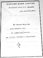Signed Single and Singed Guitar in Hendrix Sale The huge collection of Jimi Hendrix memorabilia collected by fan Bob Terry and featured in the 2004 Marquee exhibition, was auctioned on February 16th at London's Hard Rock Cafe. The sale was hosted by auctioneers Cooper Owen, specialists in music and film memorabilia. A 1965 white Fender Stratocaster went for £100,000, but several other guitars, including the remains of an instrument destroyed on stage at Brown University in 1968, failed to sell. A copy of the Jimi Hendrix Experience's first single Hey Joe, signed by all the band members, was sold for £2,000. A 1967 personal bank statement and credit receipt (right) from the long-defunct Martins Bank, fetched £850. A photo of the bank statement and other exhibition photos are here. Full auction results from Cooper Owen here.