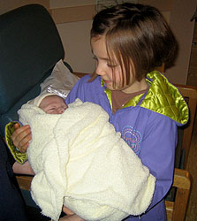 Here are some photos of the "newest addition" to our ever-growing family. Our daughter Heather gave birth to a son at 12:55am on January 06, 2008 weighing in at 8 pounds 10 ounces. Both mother and son are doing very well. The baby's name is still not 100% finalized but most likely to be either Noah, or Jackson Samuel Roberts. Needless to say both Grandparents are extremely well and are very pleased with their New Year's gift. Pictured, is granddaughter Lily, cradling her new brother. |
