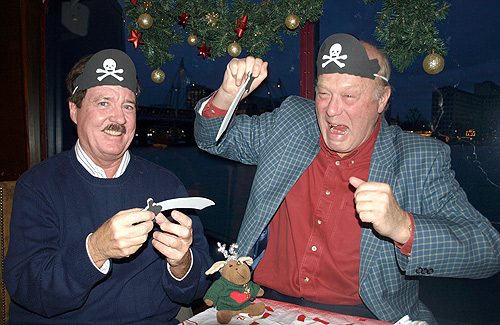 London Cutlass Altercation A couple of renegades from Radio Caroline and Radio 270 were spotted in the capital recently, partying with superstar, Cousin Moosie. Moosie is seen here presiding over a cutlass altercation between Bud Ballou and Guy Hamilton to settle the dispute as to who worked on the best station. |
