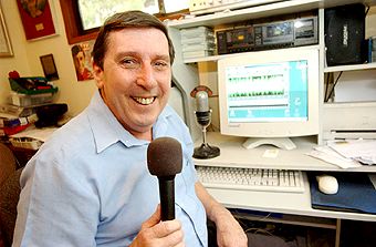 Webby sends us a great picture for the Web... Radio Caroline's Graham Webb has sent us a current picture of himself 'sockin' it to them' on the airwaves of Australia. Thanks Graham! (We wonder if every time he looks at those audio waves on the computer it brings back memories of the North Sea!) You can read much more about Graham's career here. |
