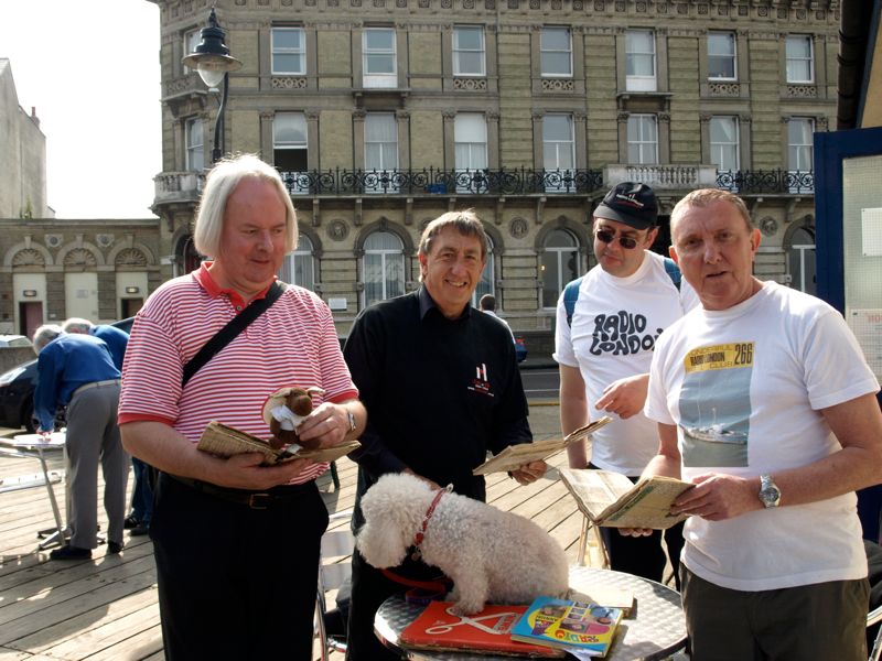 John Sales, Colin Wilkins, Keith Milborrow, Cousin Moosie and Colin's dog Lucy admire Ray Reynolds' memorabilia