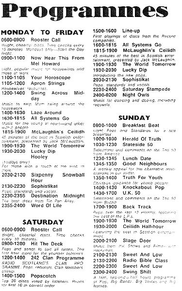 Radio Scotland, of course, attracted many listeners in Ireland. Kenny Tosh was delving into his pirate treasure chest when he came across a 1966 programme schedule which appeared in the now defunct Belfast newspaper, City Week.(Click on the photo to see a legible version)