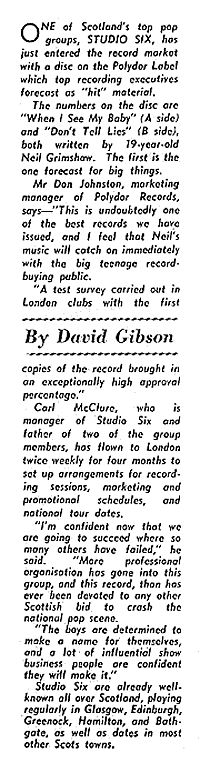 Tipped to be the next national pop sensation, Studio Six were one of Glasgow's top bands. They shared an agent with the Who and the Bee Gees, played support to the Stax tour on its visit to Glasgow and turned down two Gibb brother ditties in favour of a song written by their lead guitarist. In a two-part feature, rhythm guitarist, Clive McClure tells the story of his own band, how close they came to fame and fortune and their relationship with the other mega-groups on the Glasgow scene in the Sixties. Your
