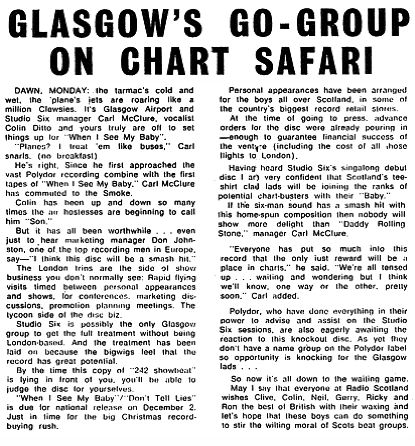 We used to fight the Bee Gees for studio time at Polydor Records off Regent Street! This was before they recorded 'New York Mining Disaster', and took off in the charts. In fact I still have two studio acetates by them, never released as singles, which Stigwood passed on to us to see if we wanted to record them, but we didn't think they were very good songs, so we went ahead with our own, 'When I See my Baby'. One Bee Gees acetate is 'The Square Cup'. This has a name and address of Abigail Music, Brook Street, London, stamped on the label. This is probably the name of the studio, which cut the acetates. The other is 'The Turning of The Tide' - again with Abigail music on the label. This may have been on one of the Bee Gees' LPs as 'Turning Tide', but I don't know without playing it. Both of these demos were recorded prior to their 'New York Mining Disaster' hit. We also have a number of Studio Six acetates, which were various mixes of the songs, prior to getting to the mix, which was going to be released. There are also some acetates of Chris McClure recordings, and I can't recollect if they were released or not. I have also two acetates with no labels on them, from the same time. I don't remember what is on those. I also have two large Revox tapes in the attic. These were recorded in a makeshift studio we set up in Glasgow, in order to send out tapes to the Radio Scotland ship. I have never been able to play them because of their size. I know that there are recordings of Studio Six and one with Stuart Henry interviewing the group when 'Baby' got released. There is also a session of various songs, which the Marmalade recorded. We played some gigs with the Who, whose 'My Generation' had kick-started them. The biggest was in what was then the Shaftesbury Theatre in London's Drury Lane. We played first on the bill, followed by Vanilla Fudge, then Jeff Beck and of course the headliners were The Who. I remember standing in the wings and was absolutely in awe at the live performance they gave. Their recordings just did not do them justice.