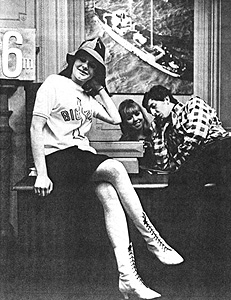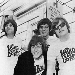(right) Swedish group the Mascots pose in 1967 teeshirts next to the Radlon registered office sign.