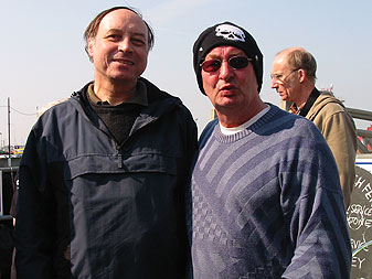 I well remember that summer, lazing around during the long school holiday. One of the joys was listening every afternoon from 3.00pm to Dave Cash who was joined at 5.00pm by Kenny Everett for the legendary Kenny and Cash Show which had been running since April. Although Kenny was the creative genius of the pair, Cash was very entertaining in his own right. He engaged in juvenile antics at the microphone but was at the same time a mature broadcaster. He had gained experience of radio in Canada and sounded professional. I understand he was highly respected by TW. I was very disappointed when he left Radio London but delighted when he returned in August 1966 just for one week, on a double late night slot from 9.00pm to 2.00am. Dave later took over from Pete Brady a second time. On Radio 1 he was given the weekday afternoon show which Pete vacated. Dave later moved to the Drivetime show. Since then of course he has presented on various commercial and BBC local radio stations. I had the pleasure of speaking to him by telephone off air when he was at Liberty Radio and invited listeners to call him during his show for a chat while the records were playing. Later I met him on the Halfpenny Pier at Harwich during one of the special reunion events. On both occasions I found him to be friendly but modest. (Above) Stephen with Dave on the Ha'penny Pier. I introduced him to Dave as 'Stephen Ches-KNEE!' |