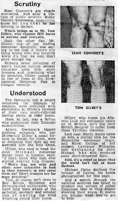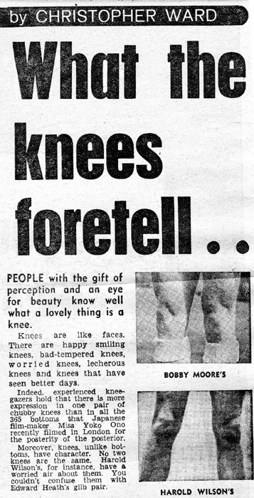 For all these years, John has keep his purple patellae under wraps. But in honour of his 2005 presentation of the Fab 40 to commemorate August 14th, member #17 has finally revealed all! Non-members may be reeling with shock, but the Knees Club has always known that patellae are a thing of great beauty. This seemed a timely occasion to share a newspaper article on the subject by Christopher Ward, written in September 1967. Click on the columns to read What the Knees Foretell! Mary Payne, Founder Member, #1 |