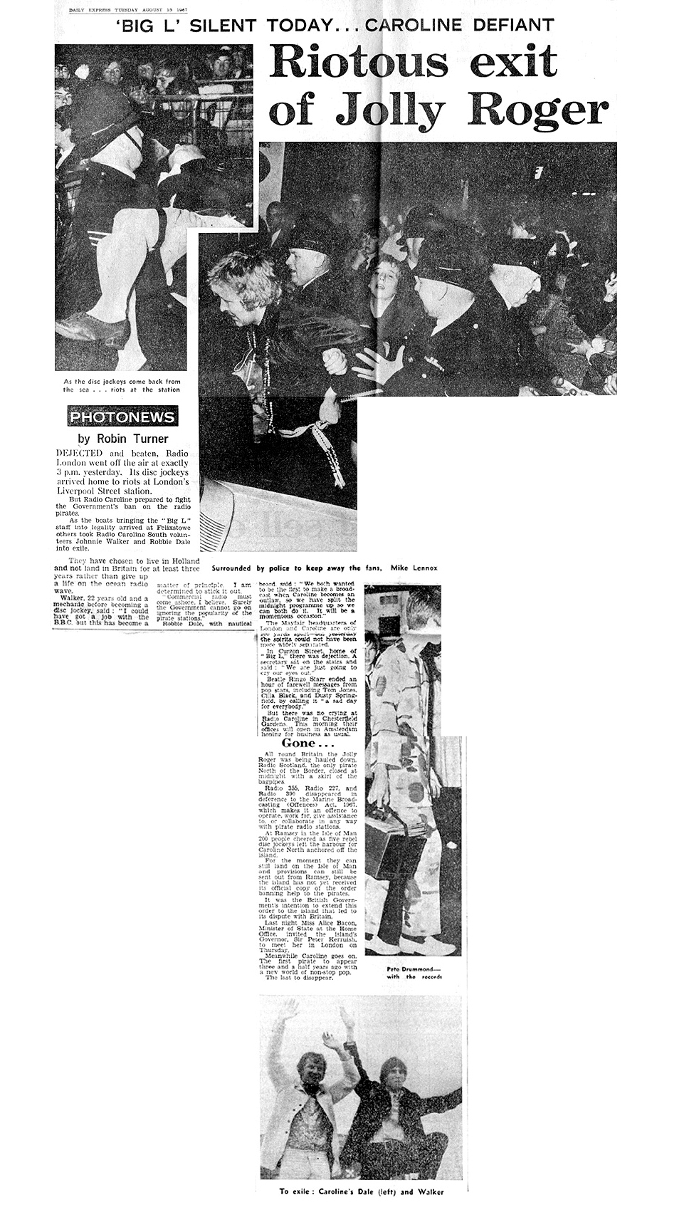 I remember Mike talking to me about the final day of Radio London on August 14th 1967; 'We arrived at Liverpool Street station in London, where we were mobbed by thousands of listeners. The story and pictures hit the headlines of the daily newspapers the following day."