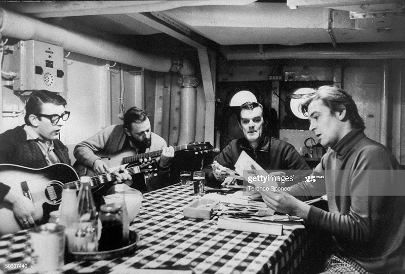 | Getty Images caption: (L-R) Disc jockeys John Edward, Paul Kaye, Tony Windsor & Mike Lennox, in the mess of pirate radio station Radio London's ship the MV Galaxy off the coast of England. (Photo by Terence Spencer/The LIFE Images Collection via Getty Images/Getty Images) |