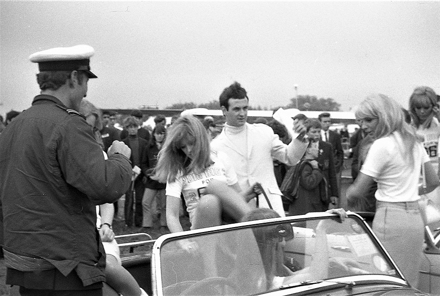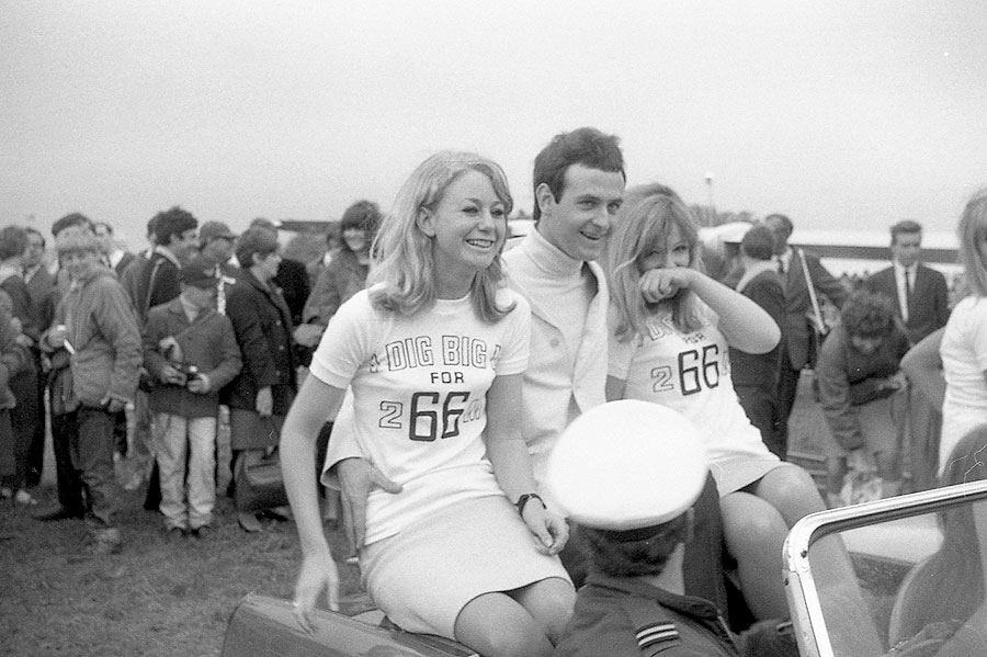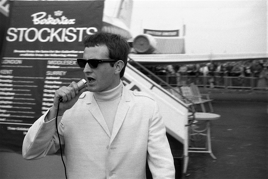 Brian Long, in his book 'The London Sound', reports that Mark Roman arrived by helicopter on Saturday 14th, to compere the 12.45 show of Berkertex's latest trendsetters. Mark, wearing a light suit instead of his trademark toga, was accompanied by six 'Big L Girls' from a West End club, wearing the 1966 design Radio London teeshirt. The girls' main purpose for being there appears to have been decorative.