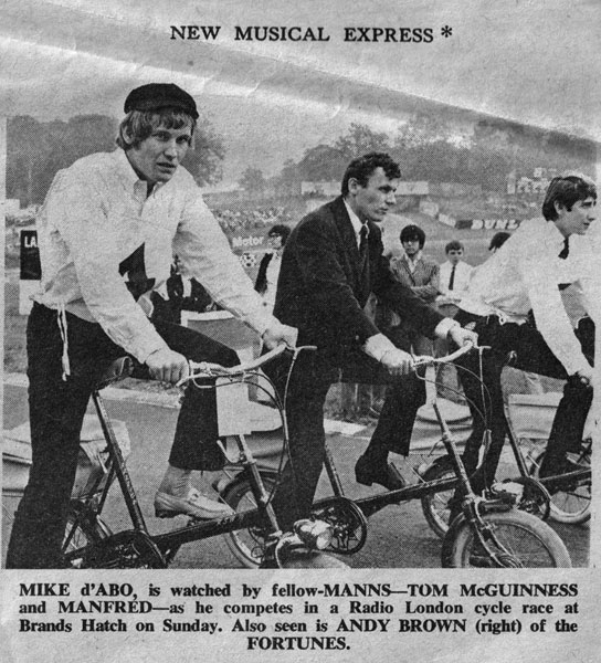 "As you say, not quite the right clothes for a bike race. It was meant to have been Kenny (in the race), but he ducked out, so it was left to me to fill the gap. It does look a little strange, but that was Big L for you!" Bands on the bill were the Bonzo Dog Doo Dah Band, Episode Six and the Symbols. Quite what a circus aerial act had in common with a Radio London pop event, we don't know, apart from the word 'aerial'! (Clipping from Mark Roman's archive.)