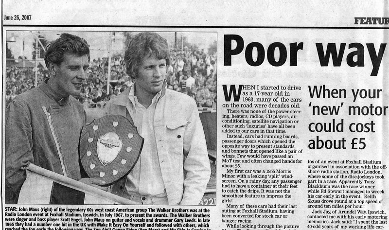 By July 16th 1967, Tony Blackburn had officially left Radio London, but like many other former Big L DJs, he continued to make personal onshore appearances on behalf of the station. He competed with Marshall Mike Lennox, Cardboard Shoes and Stewpot, in a 'Stars Race' at the Ipswich Stadium Spedeworth Stock Car meeting. Stewpot's race ended badly, as shown by the photos above. 'Star' competition was provided by Jeff Beck, John Walker and other celebs of the day, but Tony was the winner! Newspaper clippings from the Ipswich Star, June 26 2007, courtesy of Brian Nichols of the Felixstowe and Offshore Radio Facebook Page |