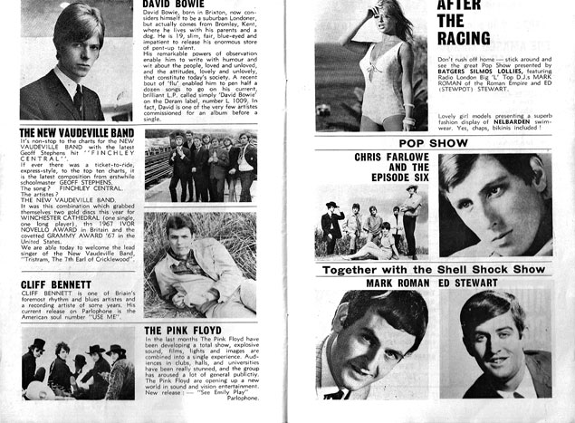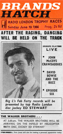The event's programme shows the impressive line-up of the The Walker Brothers, Tom Jones, the Small Faces, Paul and Barry Ryan, David Garrick, Chris Farlowe, The Pretty Things and Susan Maughan. They all made personal appearances, but did not perform, while live acts were Episode Six, David Bowie and the Buzz, John McCoy's Crawdaddies. Episode Six were signed to the Philip Birch Agency and both David Bowie and the Buzz and John McCoy's Crawdaddies – soon to change their name to The Real McCoy – played regular gigs at the Marquee Club. Radio London sponsored The Bowie Showboat, which ran from April 10th to June 12th on Sunday afternoons at the Marquee Club in Wardour Street, between 3.00 and 6.00. After a gap of a few weeks, Big L sponsored another run of The Bowie Showboat from August 21st to Nov 13th.