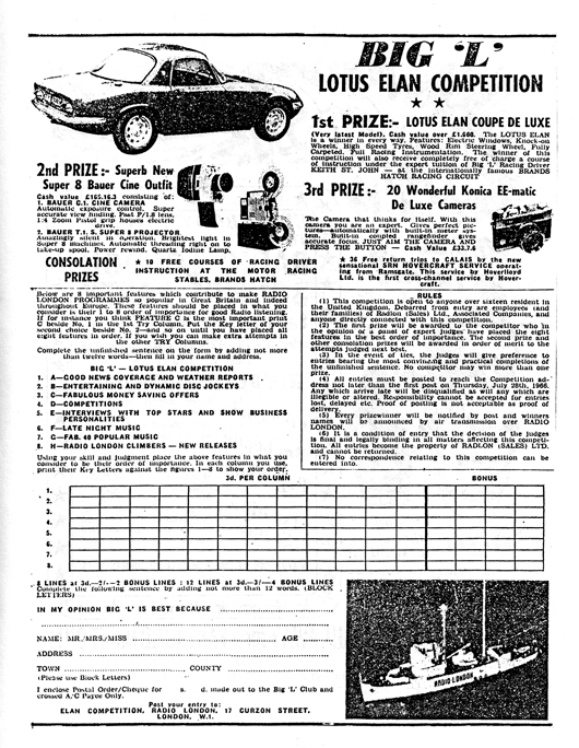 Below: The Big L Win a Lotus Elan competiton. Click on the picture to show a legible version. The competition (which cost 3d per column to enter) was scheduled to end on July 28th, but proved so popular that it was extended until September. Actress Diana Dors presented the car to the winner at 'King of the Stocks', another Radio London Brands Hatch meeting, this time featuring stock car racing.