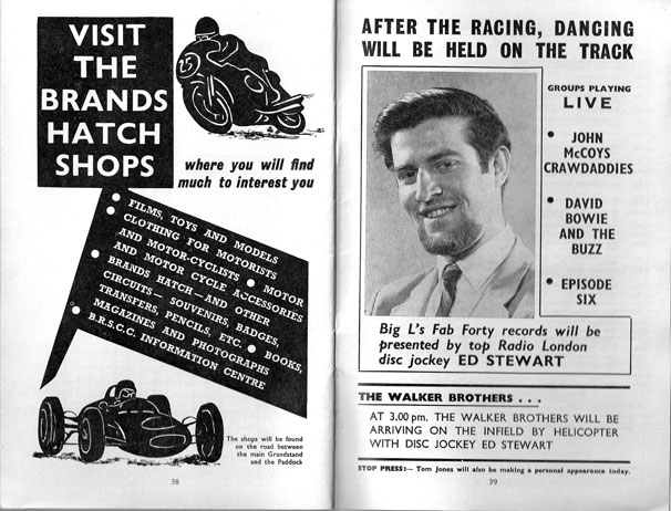 During the afternoon, a parade of celebrities around the track included the Moody Blues and Dave Dee, Dozy, Beaky, Mick and Titch. Listed in the programme as making personal appearances were David Bowie, 'Tristram, the Seventh Earl of Cricklewood' (the lead singer with the New Vaudeville Band), Cliff Bennett, Pink Floyd and David Garrick. We have found nothing to confirm that either Bowie or Pink Floyd (up to #11 from #39 in that day's Fab Forty) actually put in an appearance. However, Pink Floyd does seem to have cancelled several scheduled appearances around this time. The official Pink Floyd website does not list the band as being present, but a number of Floyd-related sites have picked up the Brands Hatch reference and listed it as an actual personal appearance. Some even have the visit to Brands Hatch on July 18th at Brands Hatch listed as being part of the band's 'The Piper at the Gates of Dawn' tour. Pink Floyd would surely have been invited to appear in order to promote the tour and the album of the same name, but the intention was never for them to perform. The band's LP was being championed by John Peel and was subsequently chosen as the final Radio London Album of the Week.