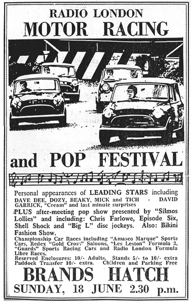The Chatham Standard advertisement, (left) which strangely features a photo of a racing Minis which has no relevance to the Radio London meeting, covers all bases by adding the words 'last-minute surprises' to the guest list. However, the advert also guest lists Cream. Was this a mistake? This is the only indication anywhere, that Cream were slated to be Radio London guests at Brands Hatch, although 'Strange Brew' was up to #4 on the a Fab Forty on the day of the race meeting.