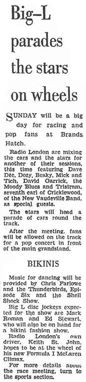 Needless to say, the motor racing fraternity was unimpressed by the appearances of such hoi polloi as radio deejays, pop stars and the shenanigans of their fans at a race meeting and scathing reports ensued in the motoring magazines. However, as the Brands Hatch attendance figures doubled that day, more Radio London events were to follow.