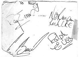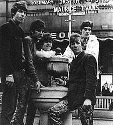 | Note: this somewhat dog-eared, or perhaps simply well-loved, autographed photo shows a four-man group. Terry Sylvester who is not pictured, definitely joined the Knees Club at Beaconsfield Youth Club, so this must have been a change-over phase in the band's line-up. | ||