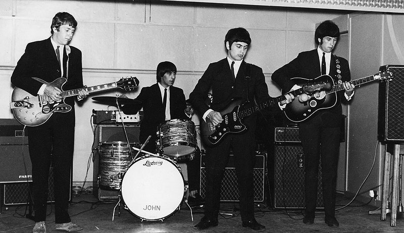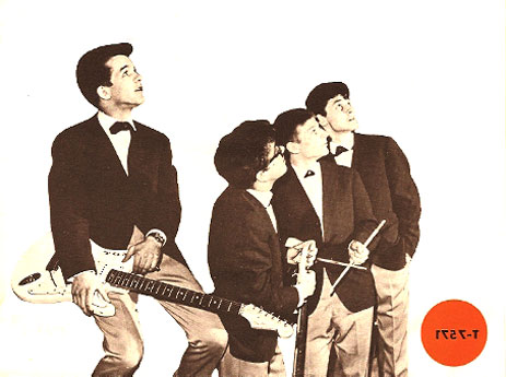 This somewhat familiar-looking photo, unearthed by Alan Field, depicts Swedish band The Violents (who did look remarkably non-violent when it was taken in 1963). If we flip the photo so that the band is facing the opposite way (below) and compare it side by side with another Violents picture sleeve, we can tell easily that it's two shots of the same band. |