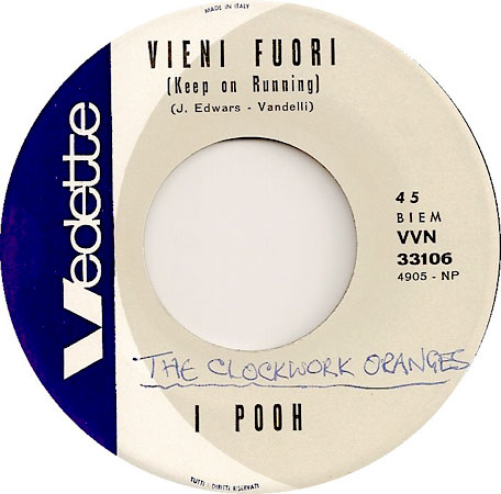 "Last year I was given the entire library of file copies from the Ember record label. Not only the UK releases but international releases and other material. Amongst that material are Greek, American and German releases by The Clockwork Oranges. Also in the library were a couple of Italian releases by 'I Pooh' and on one of those labels is also written "The Clockwork Oranges" and as the record in question is Vieni Fuori (the Italian version of Spencer Davis's Keep On Running), it's unlikely this was a note that the Clockwork Oranges should record an 'English version'. Maybe someone at Ember was suggesting that 'I Pooh' was, in fact, The Clockwork Oranges?