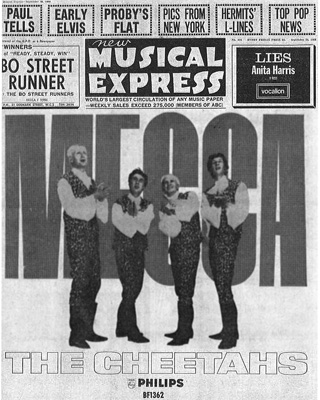 Carl Barron and the Cheetahs started their musical career in 1961, first calling themselves as the Echoes. The Birmingham quintet released their first single Only the Beginning, on Columbia in 1964. When lead singer Carl Barron (aka Colin Smith) departed shortly afterwards, Ray Bridger took over as vocalist and the band became simply the Cheetahs. With Nigel Wright on guitar, his brother Rodney Wright on bass and drummer Euan Rose, the band released a further six singles on the Philips label between 1964 and 1966. The first two of these were covers of Mecca (Gene Pitney) and Soldier Boy (The Shirelles). Their version of Mecca had appeared in the lower end of the Caroline charts in October 1964. Lyrically, Soldier Boyseems rather an odd choice for an all-male band, but this was dealt with by adding an introduction that explains the song is about an overheard conversation between a girl and her departing soldier. Ray Bridger's son Nathan has kindly supplied the two scans on the left, including the front page promo for Mecca from the New Musical Express in September 1964. In the bottom photo, Ray is on the left at the back, beside Nigel, with the Wright brothers in front. The Cheetahs would return to the Fab 40 in December 65, with their self-penned Whole Lotta Love. Nathan says: "I'm also playing in a band, Grand Harmonic, keeping the old songwriting tradition of our family going - and it's going pretty well actually." The late Carl Wayne has been mistakenly linked to the Cheetahs in publications such as the Record Collector Rare Record Price Guide. This is presumably because they came from the Birmingham area and their vocalist was known as Carl. Above, left: The height of Brummie fashion, 1964. But at least this later version of the band is wearing Chelsea boots. Carl Barron's Cheetahs were originally kitted out in animal suits, complete with matching furry paws! |