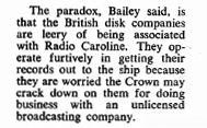 Programme Director Ben Toney not only had the onerous task of turning a bunch of (mostly) raw DJs into a slick US Top Forty team, but he also had to convince record company exploitation managers that Big L was the ideal place for promoting their wares. An item in Billboard dated May 1965, well after Radio London had established itself, (extract right) reveals that although the two Caroline stations had been broadcasting for over a year, record company chiefs remained wary of airing their new releases on the pirate stations, for fear of Crown reprisals.