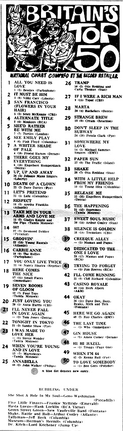 Time Seller was the first release for the new post-Steve and Muff Winwood line-up of the Spencer Davis Group. Their replacements were organist Eddie Hardin and guitarist Phil Sawyer. Apparently one band audition reject had been a pre-Elton Reg Dwight – who presumably went away and practised a lot. A complete departure from the band's previous, bluesy style, Time Seller ventures into trendy psychedelia and like the current Nirvana release, featured a strong cello-and-strings backing. The band recorded a promo for the single - presumably for the cinema - which falls into the 'so naff it's good' category. Literal attempts at depicting a time seller result in a plethora of clocks and watches and an embarrassed-looking Grim Reaper bedecked with cloak and scythe, bemusing passers-by in the park. The whole thing is mixed with home-grown attempts at psychedelic special effects. Definitely full marks for effort. In the Time Seller film promo, the lyric 'When it rains, it rains lemonade' is illustrated by some of R White's finest being tipped onto a brolly The single only reached #30 in the UK Nationals and #100 in the US Hot Hundred, but fared well in the Netherlands where it made the Top Ten. (Right) US Pic sleeve Spencer Davis Group feature on Brumbeat.net here. |