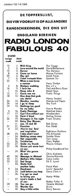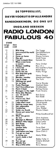 Left, is the Fab Forty chart that appears in the Belgian magazine Jukebox, dated 01/06/66. However, it is actually the chart for this week – 15/05/66. Publication deadlines meant that it was impossible for the charts in Jukebox to be in synch with the current Fab Forty. Click on the small version to check it against our list. (Thanks to François Lhote and Hans Knot for the scan. See our full feature on Jukebox and the Fab Forties it published) |