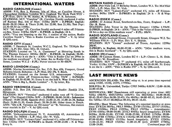 Being a very active DX-listener too, I of course wrote signal-reports to the offshore-stations. Attached you will find some scanned QSLs from those. [QSL cards are sent to listeners in return for proof of reception outside the usual transmission area, for example, by stating what track was played at a particular time.] Feel free to use them, as I would be very proud of making a (valuable?) input to a well-recognised website like yours, dealing with one of my favourite subjects! I have also sent an excerpt from the "World Radio & TV-Handbook" from 1967 covering the "International waters". Funny enough, Radio 390 is not mentioned there!![]() |