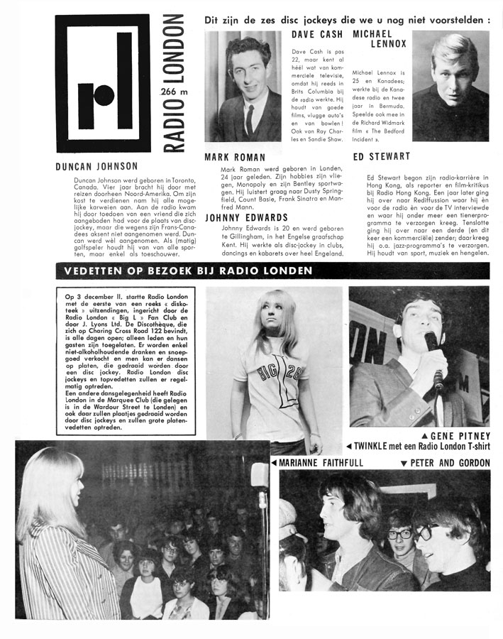 DECEMBER 1965 Jukebox marked Radio London's 1st anniversary with a photo feature. Not only are the DJs profiled, but also Programme Director Ben Toney, whose photo is presumably absent because it would would not have been included in the promotional material issued by Radlon. The magazine focussed on the fact that Ben was a Texan, that the station was run on the American Top Forty format and that the ship was a former USS minesweeper |