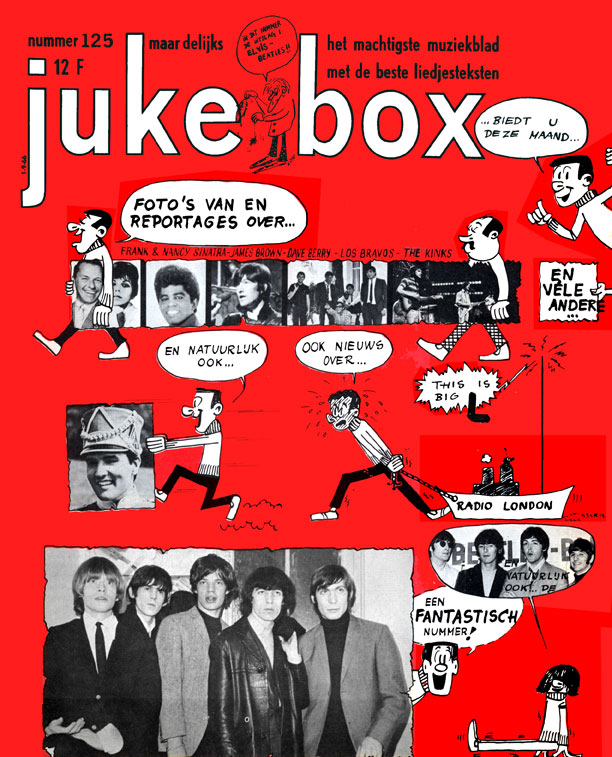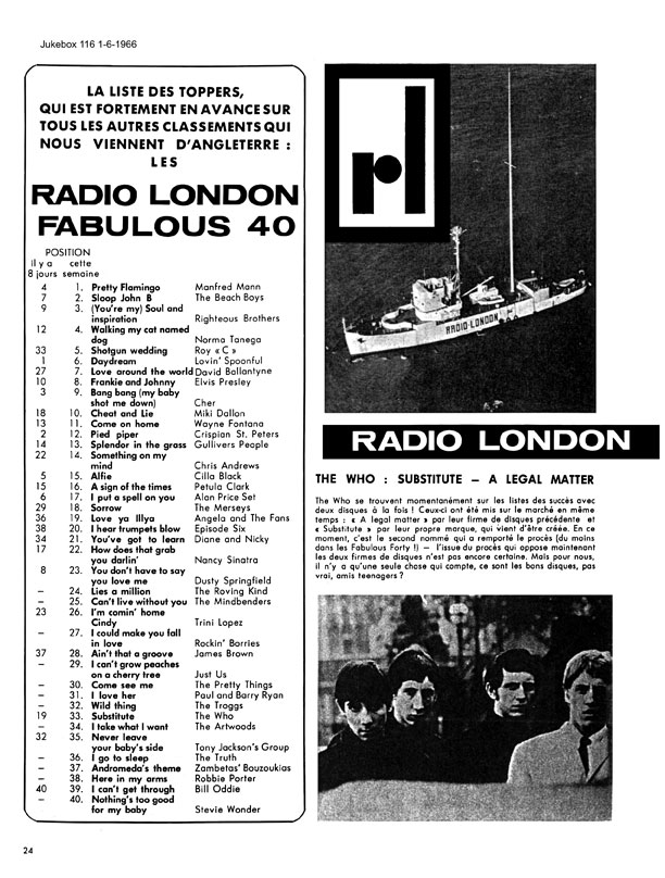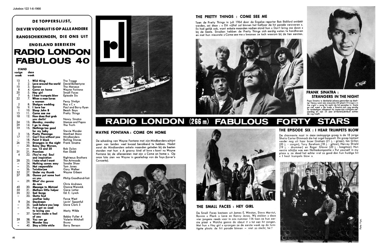 JUNE 1966 Both of these Fab Forties have the same date, but come from editions of the magazine in French (#116) and Flemish (#122). Editions of 'Jukebox' were published in both languages, with the French version launching six months earlier. Although both editions went on sale in June 1966, by the time 'Jukebox' had gone to press, the Big L Fab Forties, ironically billed as 'the charts that are always ahead of the others' were bound to be considerably out of date! No chart featured in a monthly magazine could possibly be current, although in the mid-Sixties a sales-based listing was much more likely to remain reasonably static for several weeks. The Fab Forties they printed (which must have been supplied by Radlon's Curzon Street offices) comprised Radio London's weekly playlist. Big L often gave airplay to singles that would not be in the UK shops for several weeks. Continental listeners might have to wait even longer for the release of a record they'd heard on the station. We have established that the 'Jukebox" French edition #116 features the Fab Forty for May 1st, while Belgian edition #122 carries the May 15th chart. Leaving these charts undated may well have confused readers. By the June 1st publication date, much had changed in the two Fab Forties. The May 1st #1, 'Pretty Flamingo' had left the Radio London chart; 'Wild Thing', the May 15th #1, was on its way down and had vanished by June 5th. |