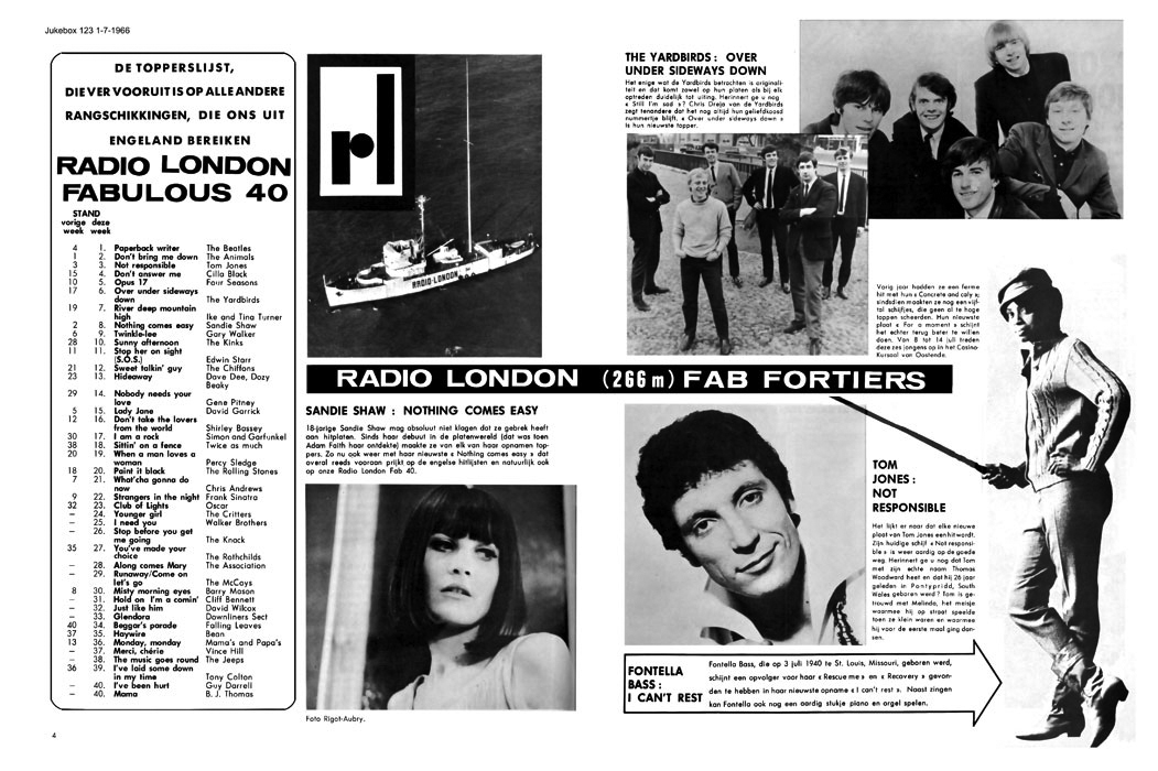 JULY 1966 We now see a pattern established in the 'Jukebox' Belgian edition for the published Fab Forty being the chart from the middle of the previous month, often the one for the week commencing with the second Sunday of that month. July's featured chart was from 12th June. Although pictured in the 'Fab Fortiers' section, Fontella Bass had not been seen on the Radio London playlist since May 29th, when 'I Can't Rest' was at #22. |