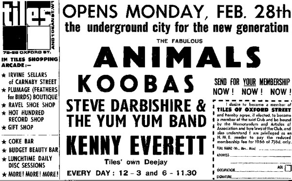 At the club's opening gig (advert left) Kenny Everett was billed as 'Tiles' Own Deejay', which implies that he was under some sort of contract with the club, as were The Next Move band.