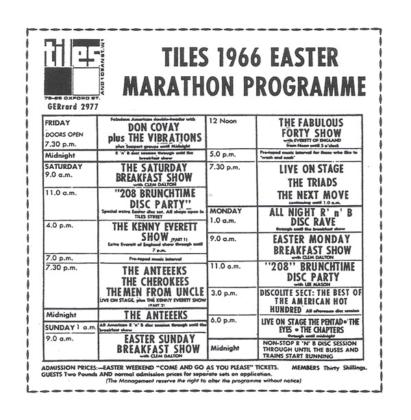 A Youtube clip of people dancing at Tiles, is undated and has no sound, but might possibly have been shot during the Easter event. There are Radio Luxembourg posters at the back of the stage and the band performing is 'The Next Move', who are on the weekend schedule for the evening of Easter Sunday.