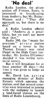 Daily Mail It was hoped that a collaboration with Radio Andorra would prove the salvation of Radio London, but this was not to be. Clipping from the Francis Pullen Collection |